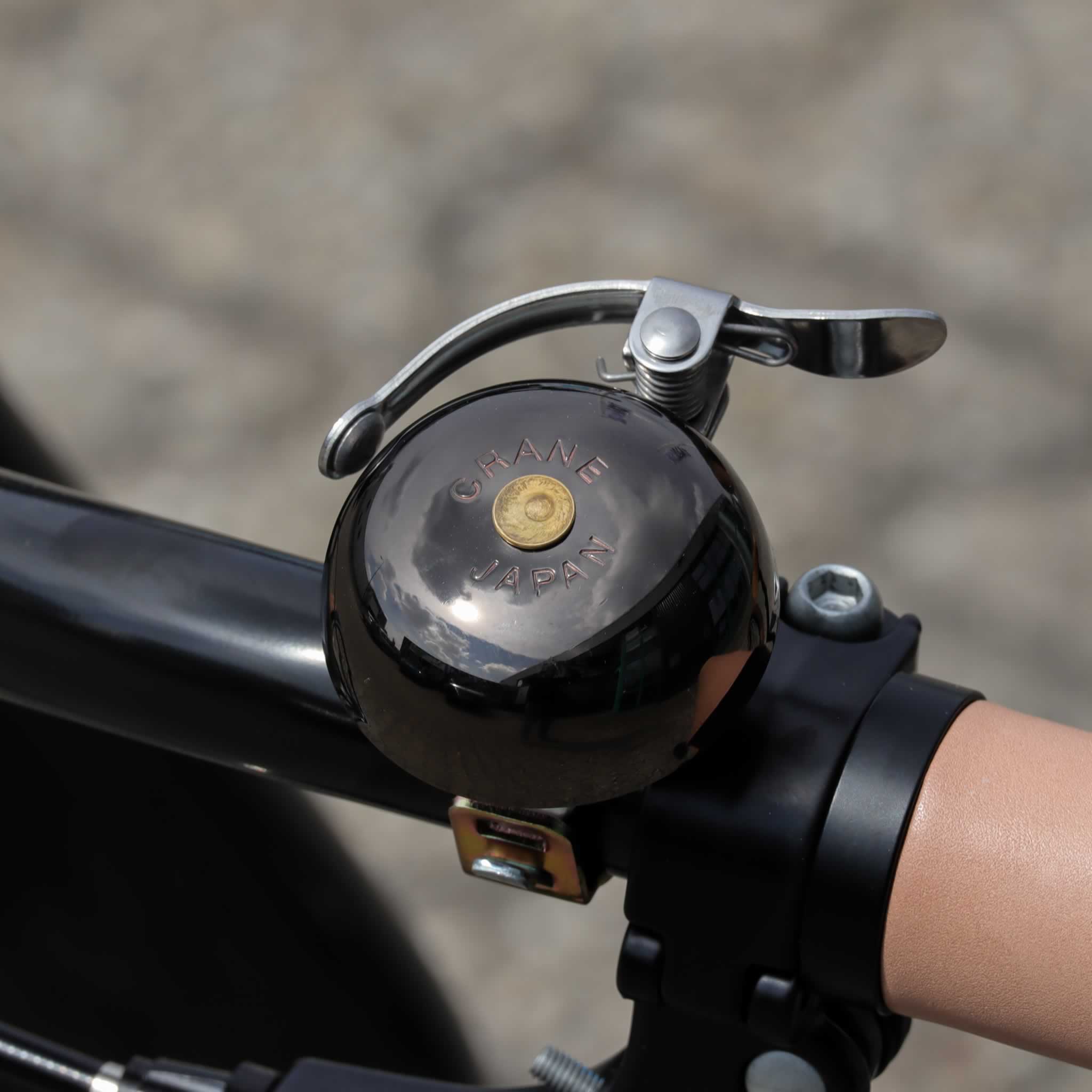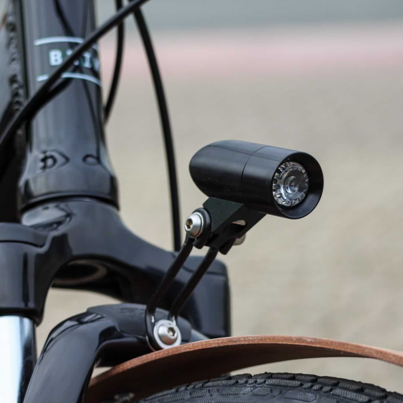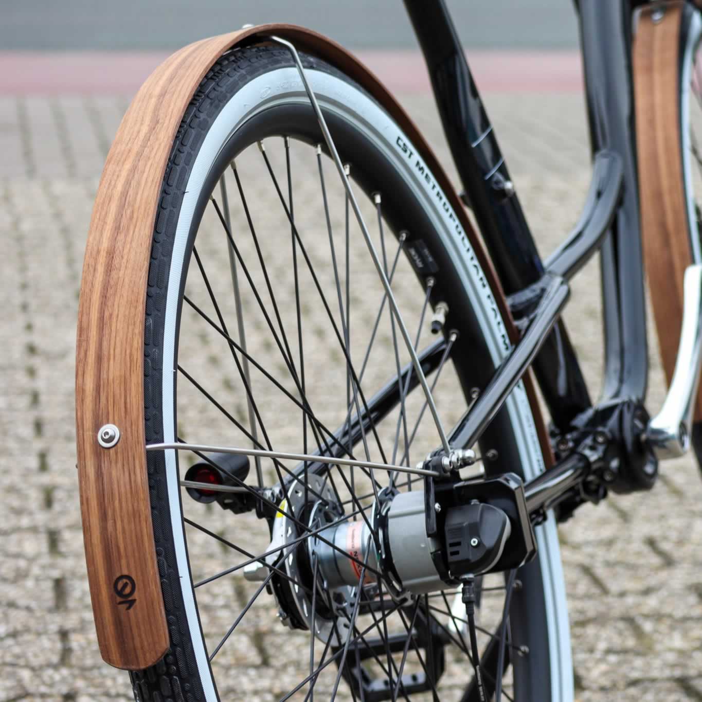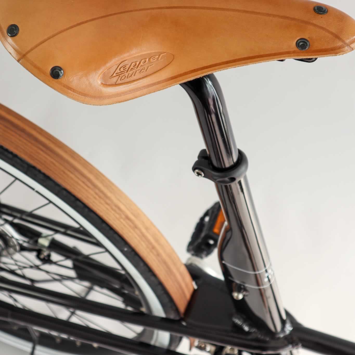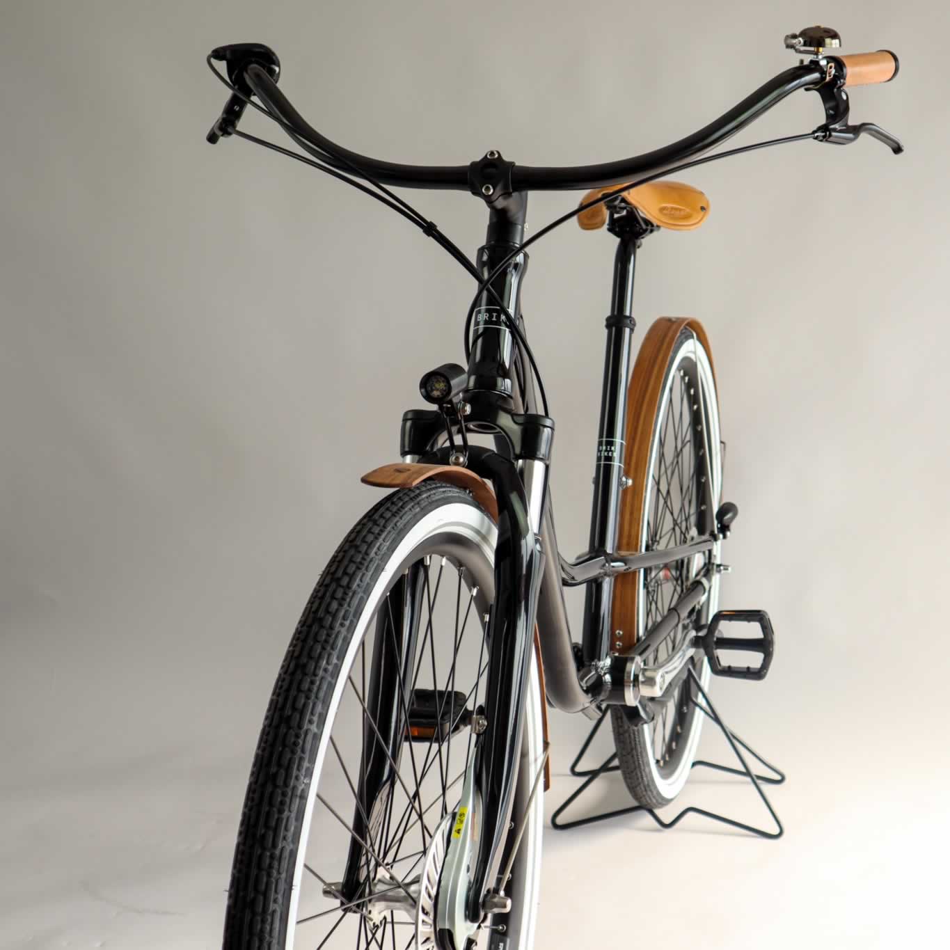 Algunos de los componentes seleccionados para la Brik Cruiser incluyen un sillín Lepper Tourer hecho a mano con puños a juego, un timbre Crane Neo Black, luces Rindow Bullet y guardabarros de madera de nogal Odin.